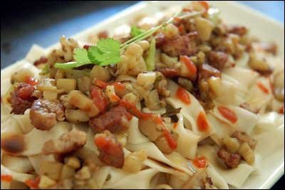 4、添加四季豆和辣椒,炒匀盛出,浇在鲜面条上服用。