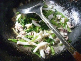 2. 烧锅倒油烧热,下入姜丝炝锅。接着,下入焯好的墨鱼,加适量的料酒。翻炒一下。