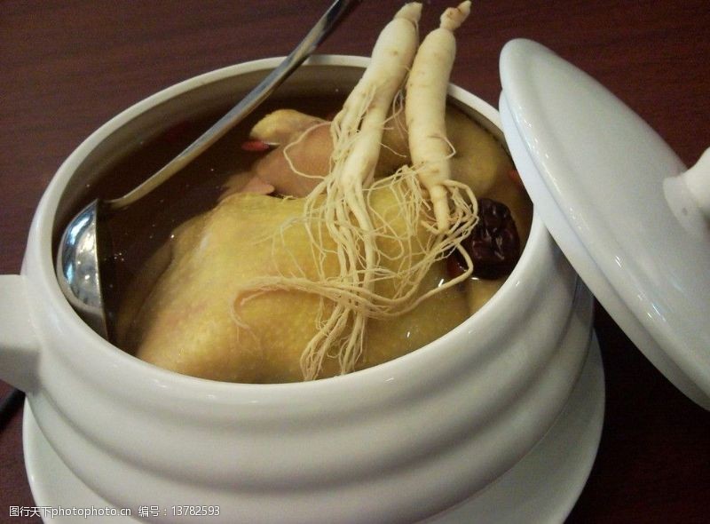 五、人参炖鸡。野山参(鲜)一支30克左右,加黄芪(干)30克左右,把参和黄芪放在鸡肚里,把鸡放在瓷盆里封好后,放在水里慢火煮之,鸡脱骨后,每天早晚食之,约7天吃完。