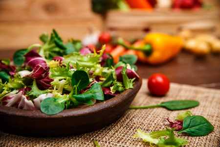 4.准备酸辣沙司,将盐,姜和醋放在小碗晨,放入芥末和橄榄油,搅拌均匀,浇到沙拉上,再搅拌。