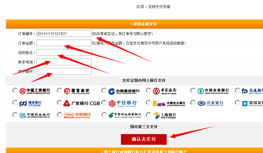 选择你作用的银行,如果没有列出你使用的银行,请选择国内第三方支付,支付宝支付。点击确认去支付。会转到支付宝网站支付页面。
